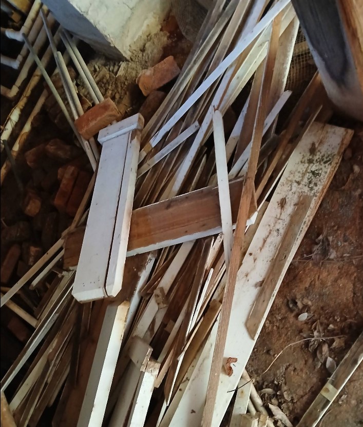 - Garages crowded with old wooden pallets, recycled pallets, electronics removal items, and project leftovers